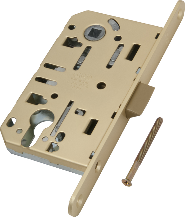 Замок межкомнатный под цилиндр в цвете матовая латунь с пластиковым язычком серии MEDIANA EVOLUTION отличается бесшумностью при закрывании. Защелка разработанна инженерами компании AGB и объединяет в себе надежность, качество используемых материалов, точность механических соединений и инновации. Все замки серии Evolution имеют один размер и взаимозаменяемы между собой.