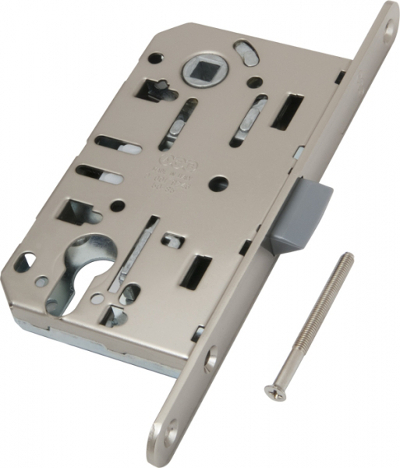 Замок межкомнатный AGB Mediana Evolution (Медиана Эволюшн) под цилиндровый механизм. AGB Mediana Evolution с пластиковой реверсивной защелкой, что обеспечивает бесшумное открывание и закрывание двери. Защелка приводится в действие цилиндровым механизмом и фалевой ручкой. Рекомендован для установки в межкомнатные двери. Цилиндр и ручки в комплект не входят.