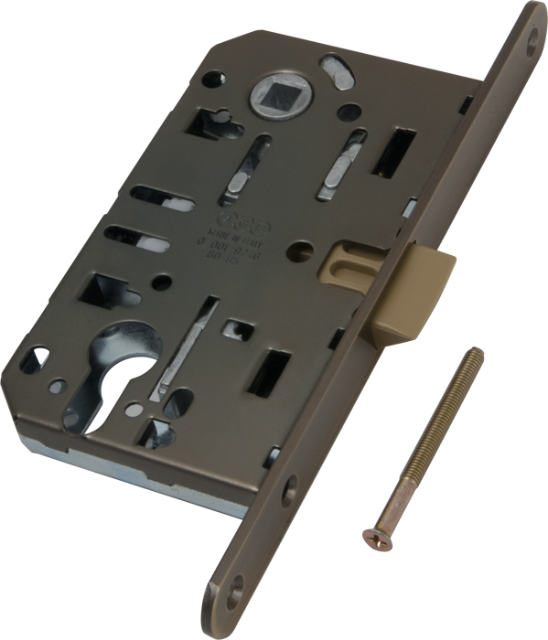 Замок межкомнатный AGB Mediana Evolution (Медиана Эволюшн) под цилиндровый механизм. AGB Mediana Evolution с пластиковой реверсивной защелкой, что обеспечивает бесшумное открывание и закрывание двери. Защелка приводится в действие цилиндровым механизмом и фалевой ручкой. Рекомендован для установки в межкомнатные двери. Цилиндр и ручки в комплект не входят.